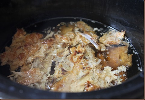 Now place these scraps into your crockpot along with onion, celery, or any other seasoning and veggies you like. Fill with 4-6 C. Water. I put this on Hi for a couple hours before I went to bed, then turned it to Low and let it cook overnight.